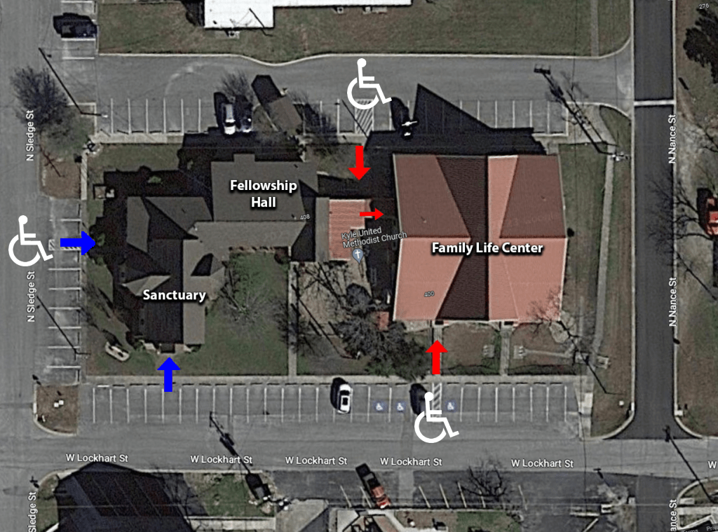 Our services are held in the Sanctuary at 9am (has wooden doors) and the Family Life Center at 11am (the larger building on the East side of the church with the red doors). There are doors in front and back of the FLC which are ADA accessible. The accessible entrance to the sanctuary is on the side of the sanctuary building (enter by the bell tower).
