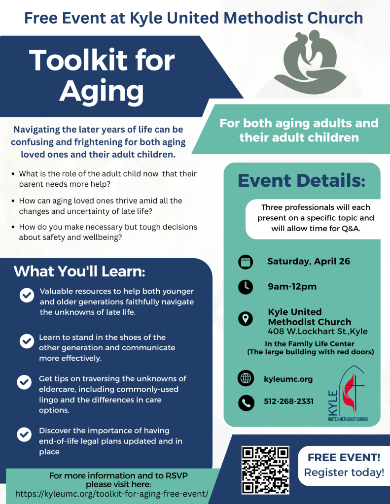 This Toolkit for Aging event offers valuable resources to help both younger and older generations faithfully navigate the unknowns of late life. Learn to stand in the shoes of the other generation and communicate more effectively. Get tips on traversing the unknowns of eldercare, including commonly-used lingo and the differences in care options. Discover the importance of having end-of-life legal plans updated and in place.