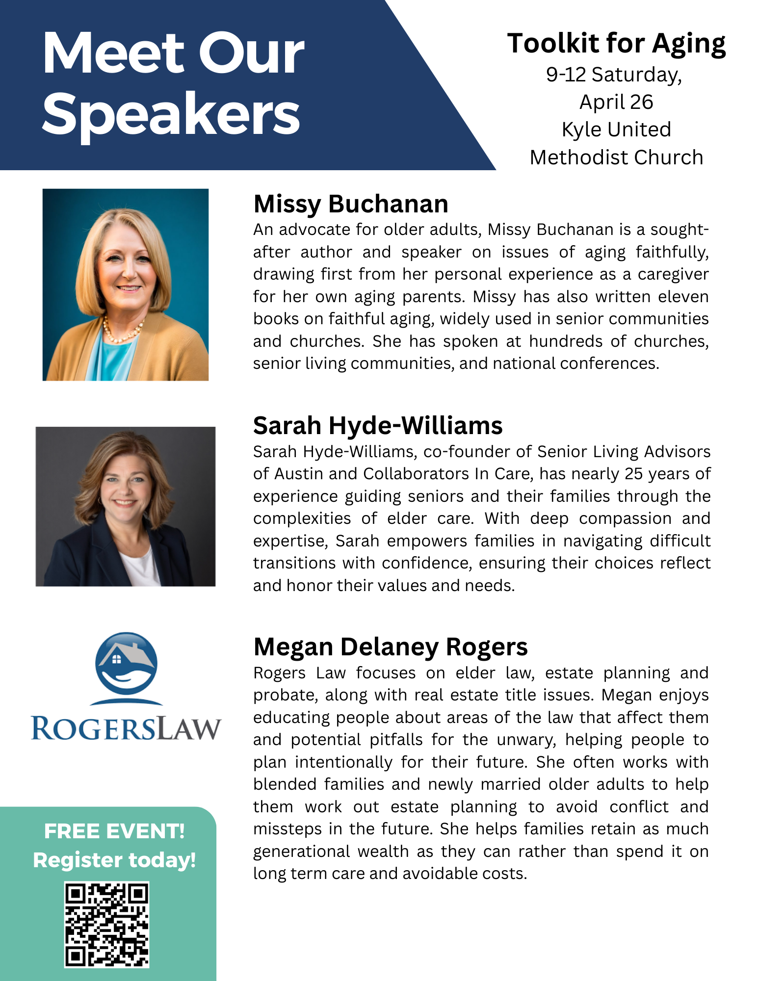 An advocate for older adults, Missy Buchanan is a sought-after author and speaker on issues of aging faithfully, drawing first from her personal experience as a caregiver for her own aging parents. She has appeared several times on Good Morning America with co-anchor Robin Roberts who describes Missy as “the rare soul that understands, truly understands, older adults: their fears, struggles and hopes.” Missy was also the co-author of Robin Robert’s mother Lucimarian Roberts’ memoir, My Story, My Song. Missy has also written eleven books on faithful aging, widely used in senior communities and churches. She has spoken at hundreds of churches, senior living communities, and national conferences, including the largest United Methodist Church in the U.S.